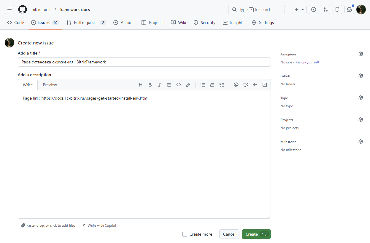 Вы перейдете в репозиторий GitHub. Форма Issue откроется автоматически.