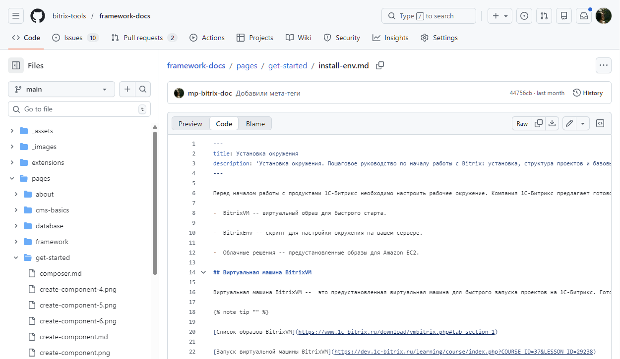 Документация Bitrix Framework находится в открытом репозитории на GitHub. Если вы нашли ошибку, хотите исправить материал или добавить новый — напишите нам. Мы внимательно относимся к любым предложениям и стараемся отвечать быстро.