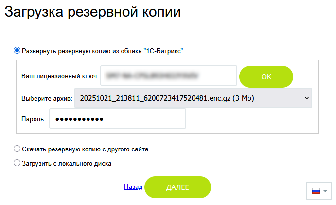 развернуть копию из облака 1С-Битрикс — укажите лицензионный ключ, архив и пароль,