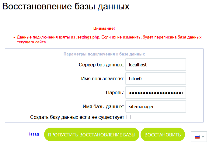 Пропустить восстановление базы — кнопка восстанавливает только файлы.