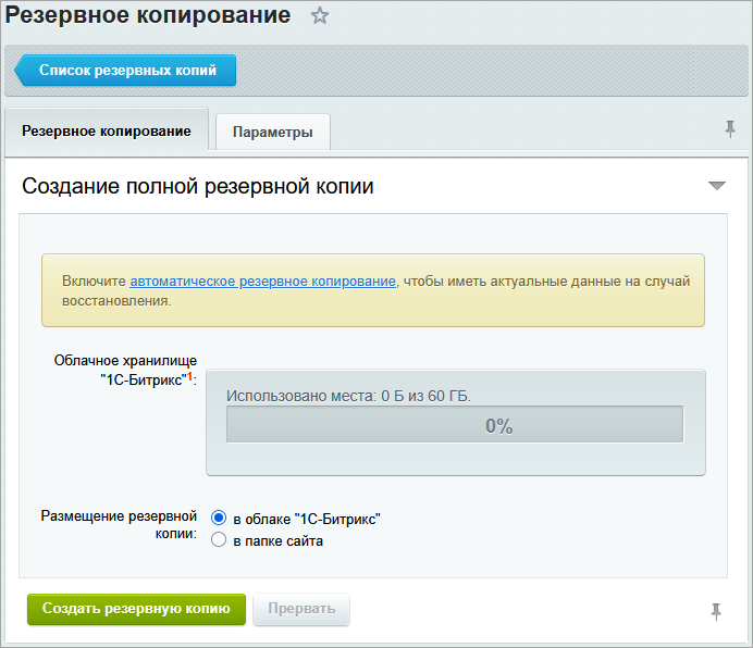 Резервные копии можно хранить локально на сервере, в облаке 1С-Битрикс или в стороннем облачном хранилище.