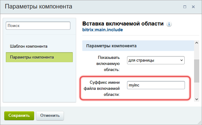 Имя файла области для раздела или страницы содержит суффикс. Его задают в параметре компонента Суффикс имени файла включаемой области. Например, это может быть myinc. В таком случае имя файла раздела будет sect_myinc.php, а страницы mypage.php — mypage_myinc.php.