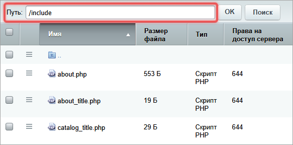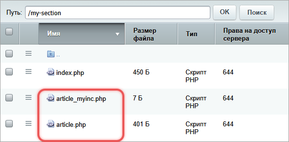 Файл включаемой области для раздела размещают в этом же разделе сайта. Для страницы — в той же директории, где расположена страница. Например, страница article.php находится в папке /my-section/, значит файл включаемой области article_myinc.php создаем тоже в /my-section/.