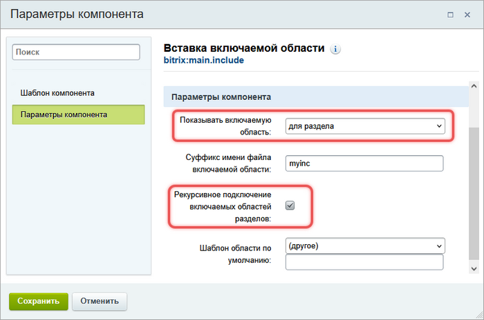 Рекурсивное подключение включаемых областей разделов — отметьте опцию, чтобы область отображалась в подразделах.