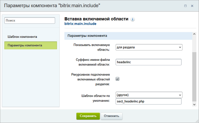 sect— для раздела. Область отображается на всех страницах раздела. Если в компоненте включить опцию Рекурсивное подключение включаемых областей разделов, область отобразится и на страницах подразделов. -