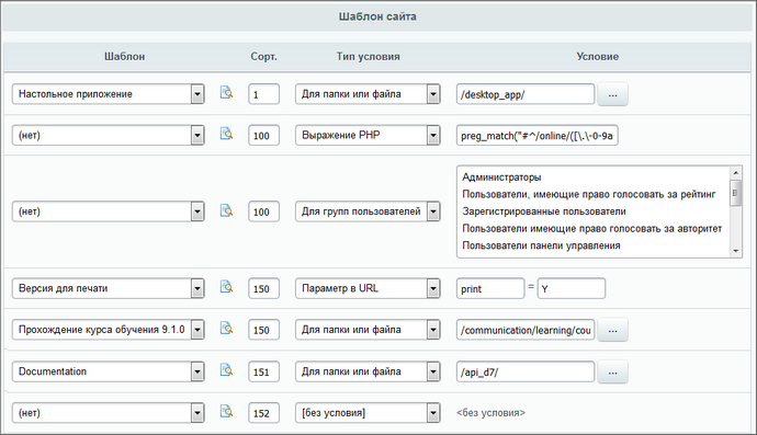 Количество шаблонов на сайте не ограничено. Для каждого шаблона можно задать условие, при котором он будет применяться. Доступны следующие типы: