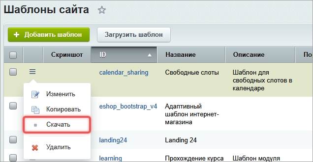 Шаблон можно экспортировать в файл <идентификатор_шаблона>.tar.gz. Для этого в меню шаблона нажмите Скачать .