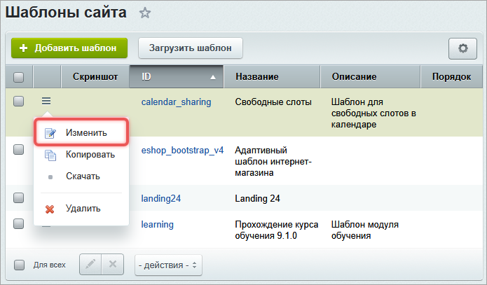 Через административный раздел. Откройте список шаблонов и в меню шаблона нажмите пункт Изменить.