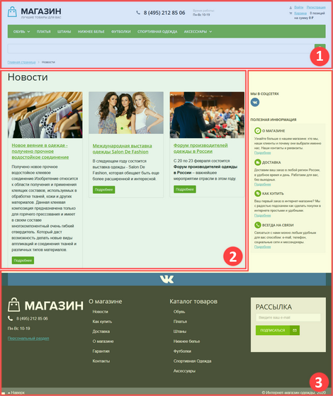 <идентификатор_шаблона>/footer.php. Содержит контактную информацию, дополнительное меню, информацию об авторских правах.