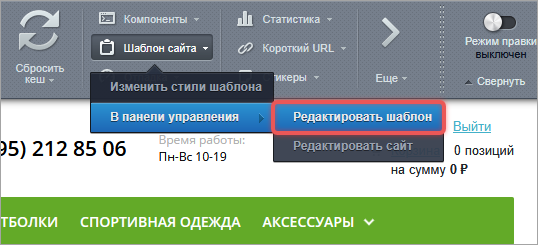 Через публичный раздел. На административной панели нажмите Шаблон сайта > В панели управления > Редактировать шаблон.