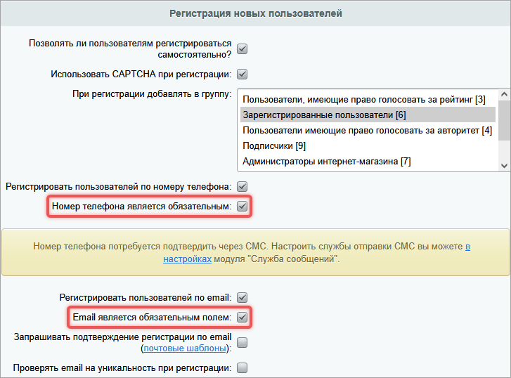Номер телефона и email можно сделать обязательными для регистрации, если в настройках Главного модуля отметить опции Номер телефона является обязательным и Email является обязательным полем.