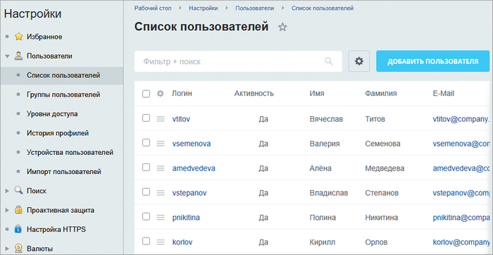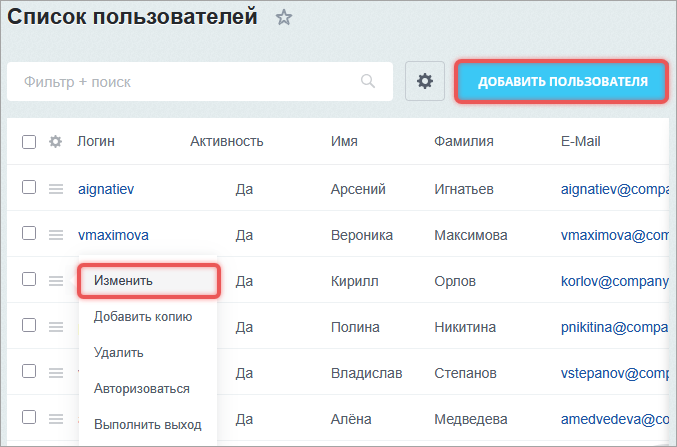 Откройте страницу Настройки > Пользователи > Список пользователей.