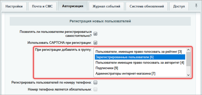 На вкладке Авторизация установите флаг Позволять ли пользователям регистрироваться самостоятельно.