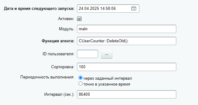 CAgent::AddAgent( "CStatistic::CleanUpStatistics_2();", // имя функции "statistic", // идентификатор модуля "N", // агент не критичен к кол-ву запусков 86400, // интервал запуска — 1 сутки "07.04.2025 20:03:26", // дата первой проверки на запуск "Y", // агент активен "07.04.2025 20:03:26", // дата первого запуска 30 ); -